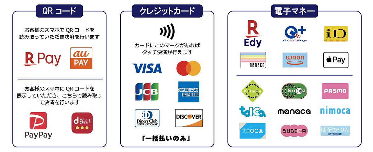 ※電波状況により手続きにお時間をいただく場合、その他状況により、一部の決済をご利用いただけない場合がございます。その場合は現金のみでのお支払いに変更させて頂く場合もございます。予めご了承ください。